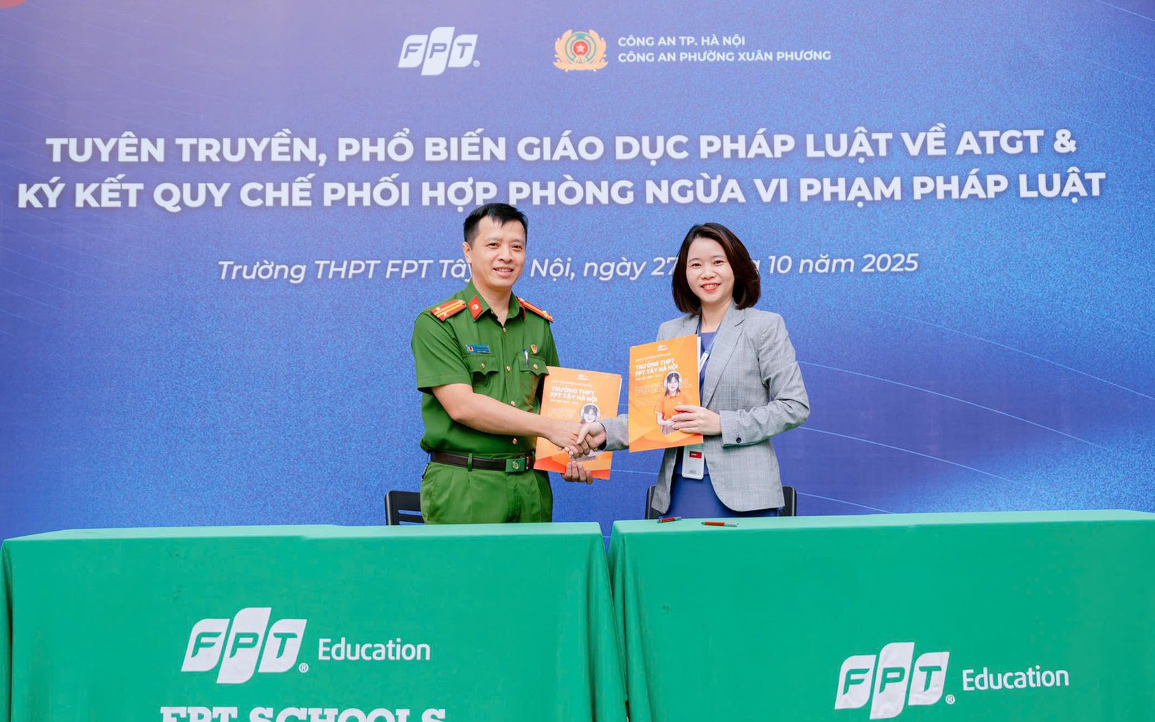 Vừa qua, Trường THPT FPT Tây Hà Nội phối hợp cùng Khoa Cảnh sát Giao thông - Học viện Cảnh sát Nhân dân và Công an phường Xuân Phương tổ chức tuyên truyền, phổ biến, giáo dục pháp luật về an toàn giao thông; ký quy chế giữa Công an phường và nhà trường trong việc tuyên truyền, quản lý, giáo dục pháp luật, phòng ngừa học sinh làm trái pháp luật.